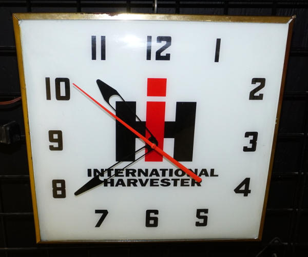 15"x15", runs, we could not get to light, might just need a new bulb; I'm pretty sure the glass advertising face is a replacement in an original clock body