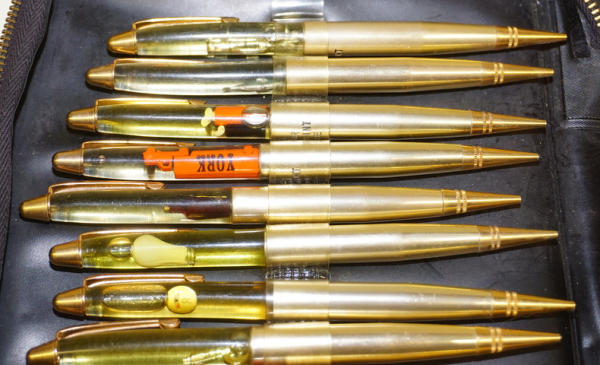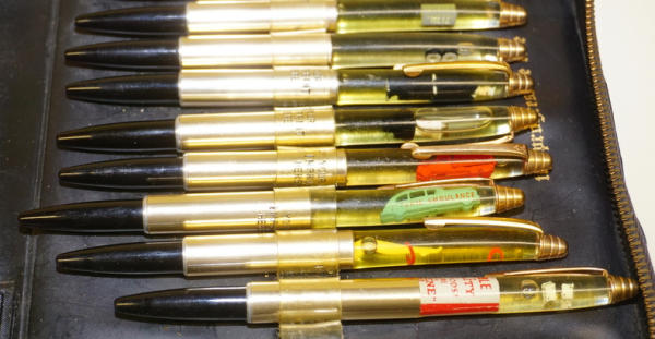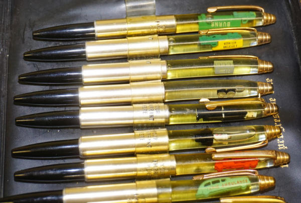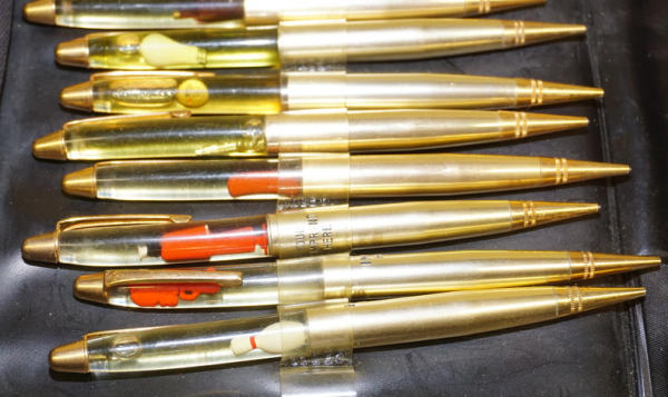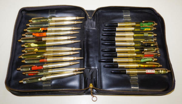 22 different floaty pens! Several with Trucks & Cars; even a ladies leg! All nice, all in the original leather case, sells as a set