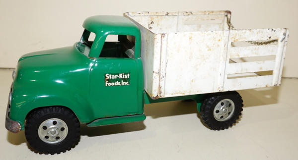 Cab is about 90% condition, White stake bed is about 85% with some stains, might clean up with some work; 1954 did not have the can graphics on the sides