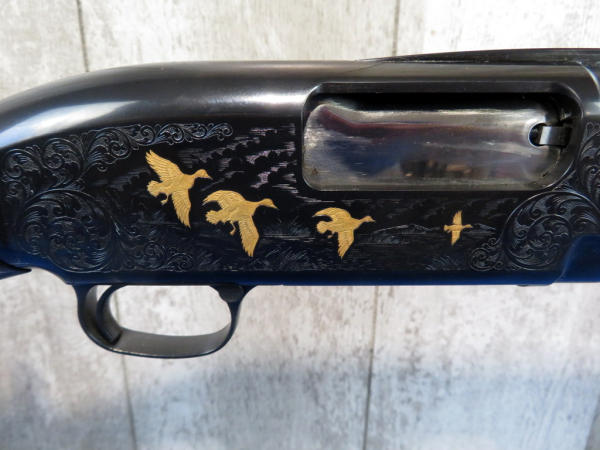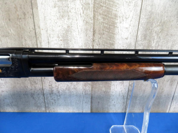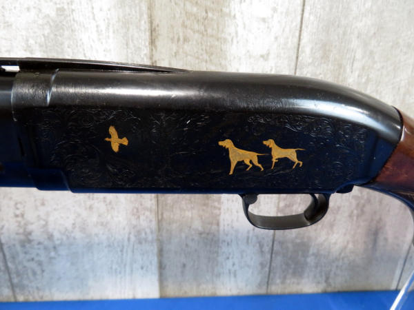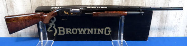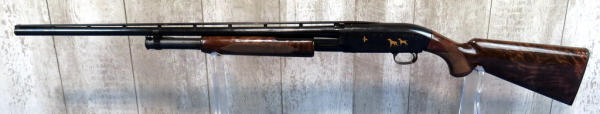 Highly engraved receiver with gold inlay duck & dog scenes; appears mint & unfired; high gloss wood finish; made in Japan; 2.75" chamber; MC; 26" VR-BBL; original box; great collector piece! SN#07537NM972; from the Samuel Burtwistle Estate