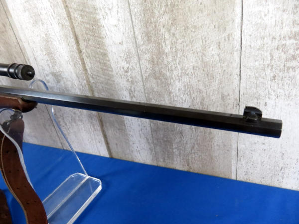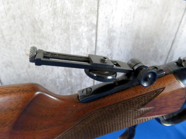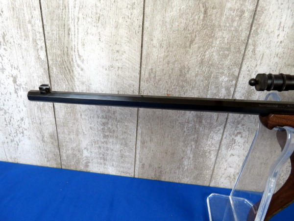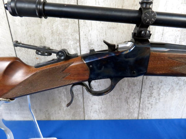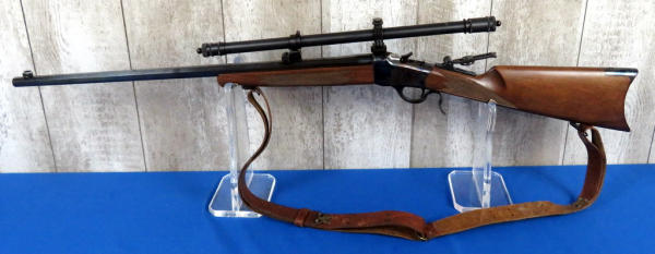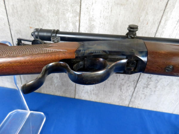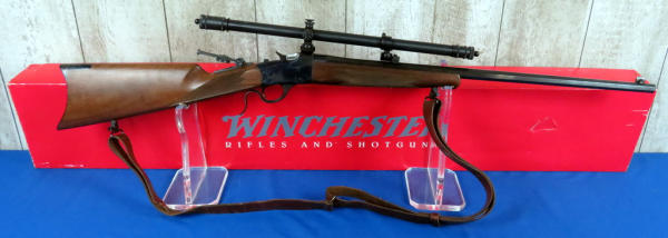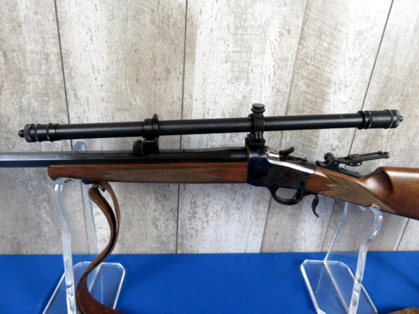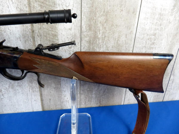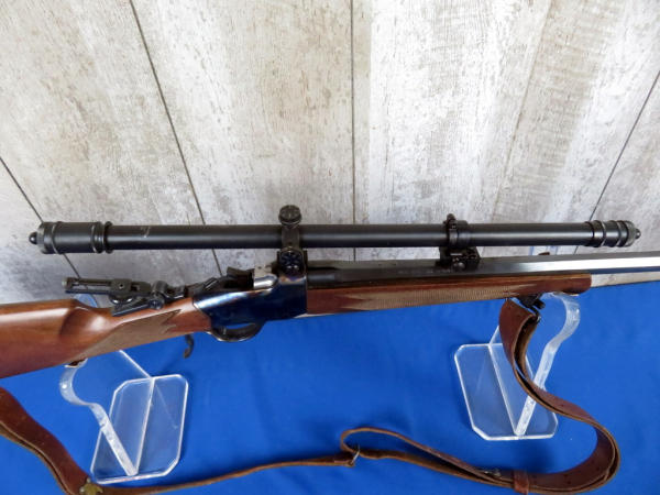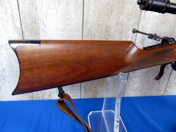 24" Oct. BBL; smooth action; case hardened receiver; rear tang flip up peep sight; Wm Malcom 6x target scope is clear w/metal screw caps; original box; leather sling; nice set-up; mfg. 2003-06; SN#00228MV85A