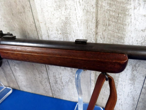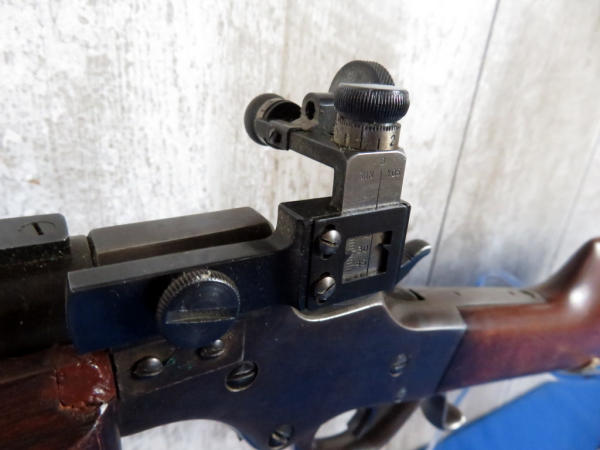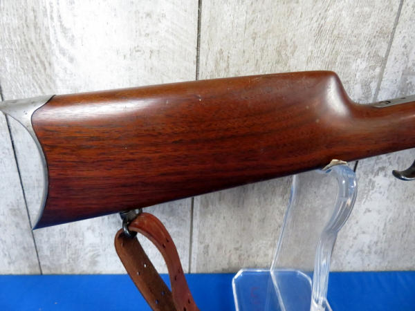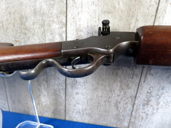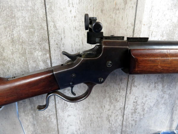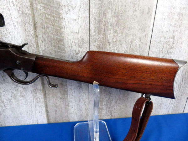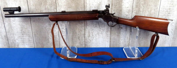 22.5" heavy BBL; falling block is smooth; has some bluing wear; thick wood forearm; wood has some marks from use; leather sling; Redfield target sights added; crescent buttplate; SN#55677