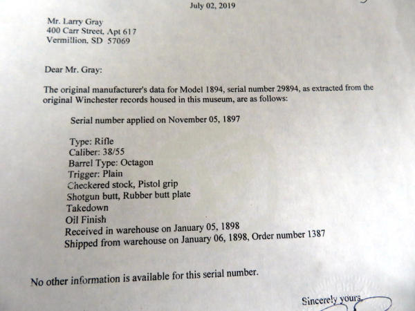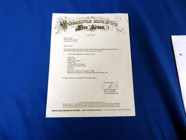 Beautiful iconic Model 94! This has been professionally restored on the stock and reblued; 26" Oct. BBL; has takedown lever on end of full magazine tube; beautiful wood and finish; smooth action; comes with a Cody Museum letter; mfg.1897; wonderful lever action! SN#29894