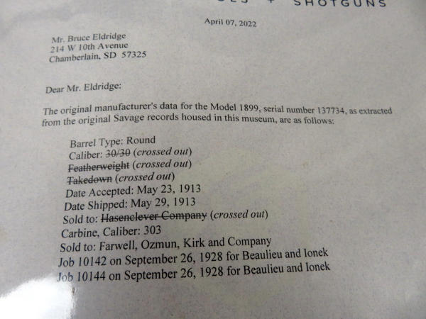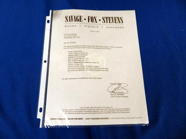 has a 20" featherweight barrel; action is alittle stiff, needs some oil; had a saddle ring at one time but is missing; bluing is thin; wood overall is very nice; comes with Cody Museum letter; mfg.1913; SN#137734