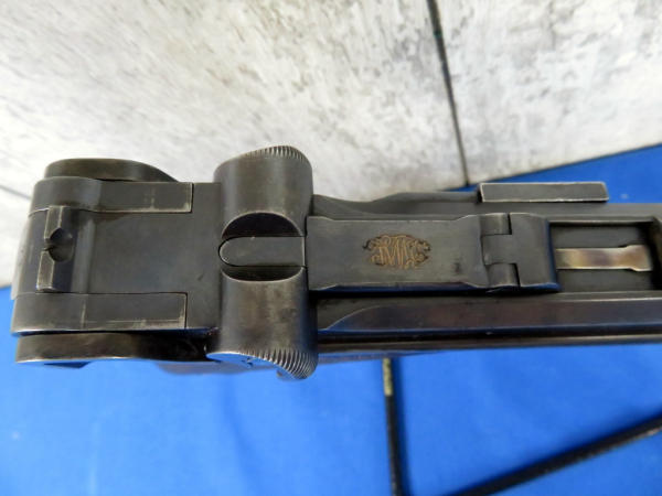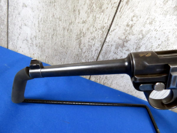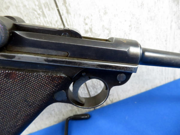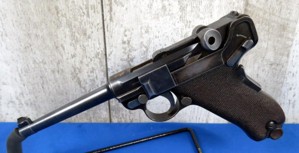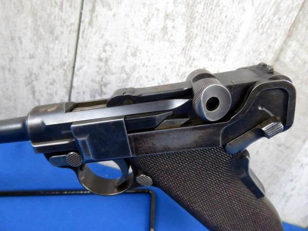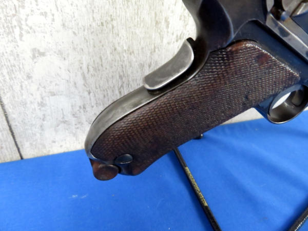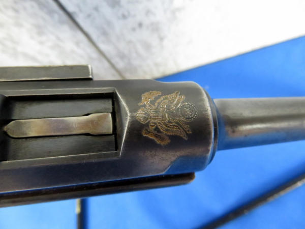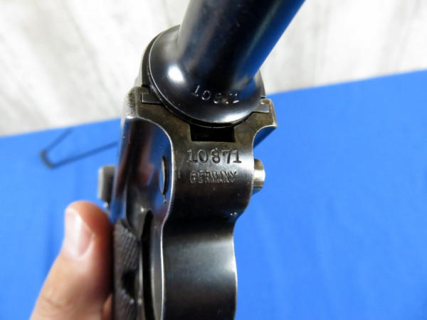 4.75" BBL; some bluing finish loss on spots; wood checkered grips; American Eagle crest is stamped over the chamber; there were approx. 11,000-12,000 of these marked "GERMANY" below the SN#; one magazine; all #'s matching; magazine is not a #'s matching; early toggle & grip safety; SN#10871