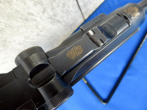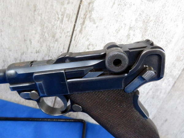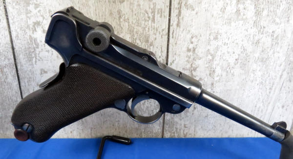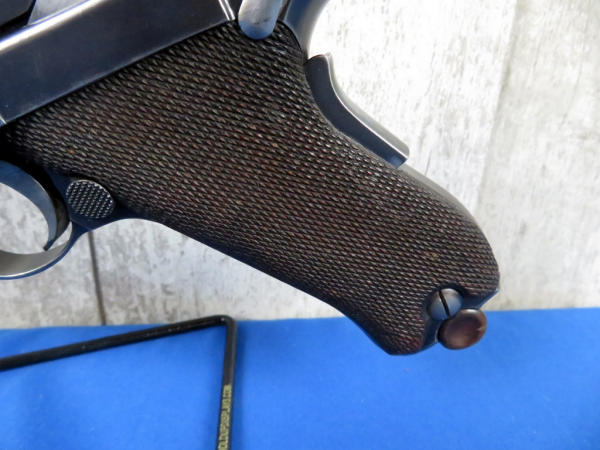 4.5" BBL; all #'s matching; period correct magazine; has American Eagle Crest; toggle on grip; overall very clean and nice bluing; checkered wood grips; SN#28431