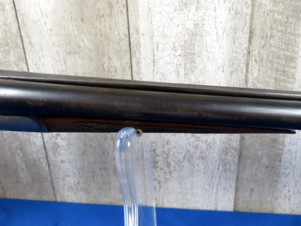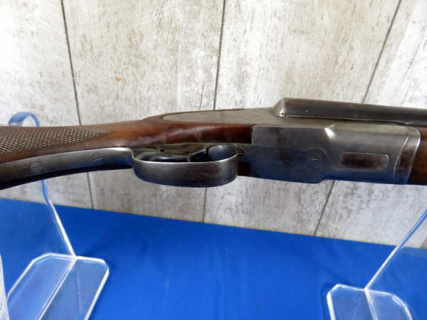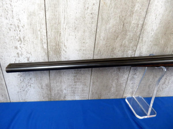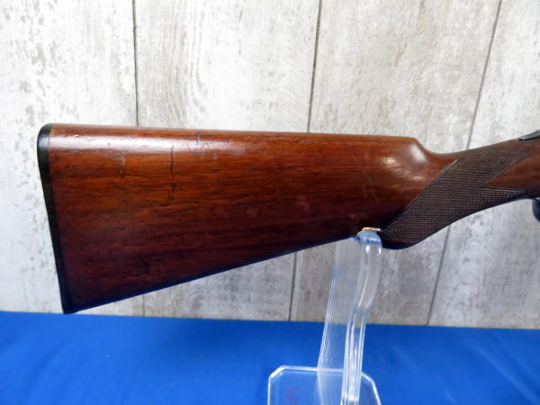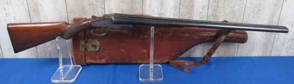 28" BBLs; break action is alittle stiff from not being used; bluing is starting to thin; stock has a minor repair on right side behind the receiver; butt plate has a chip in the top; left-CC & Right-MC; two triggers; includes a period correct leather double barrel case; case does have some marks and wear; SN#46302