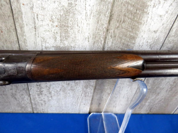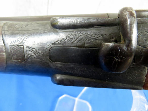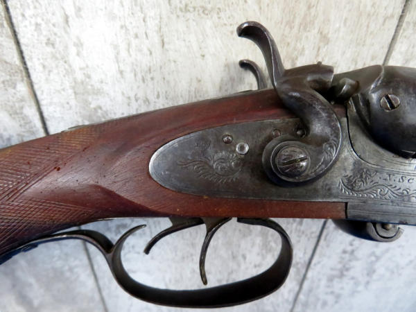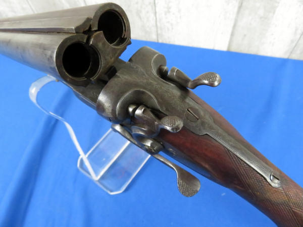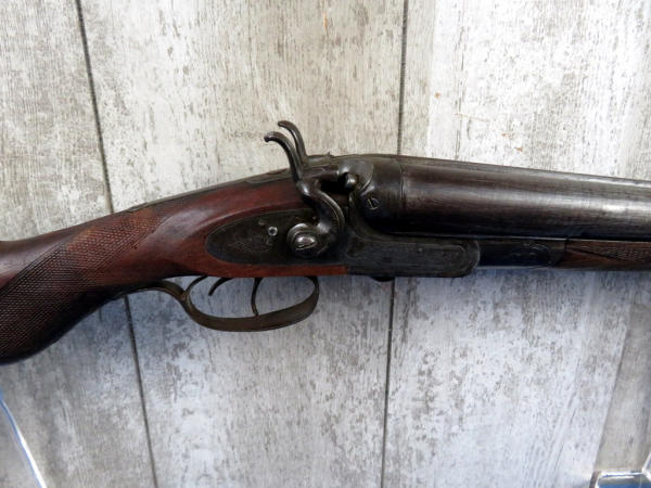 early and unique shotgun; 32" BBLs; easy break action; has thumb release; both mechs works, two triggers, one trigger has the tip missing; bluing is thin; wood has nice look; bottom tang has some damage; has some engraving on the metal; SN#2766; no Transfer needed
