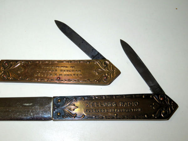 both 9.5" long; folding blade in handle has Remington marks; one is "Kellogg Radio" & other "Solomon Ketcham - Nelson V.W. Colyer"; neat pieces; sell 2x the money