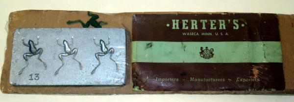 lead mold is 4"x2"; makes 3 frogs that are 1.25" long; has a rubber frog included; sealed in plastic; original sleeve; neat piece