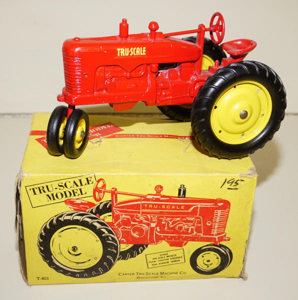 Toy is near mint original, few light paint chips; early version with looped wire drawbar and non-painted grill; Box is fairly rough, missing 3 end flaps and has punctures, rates 6 condition; not the best box, but a really scarce toy, I believe the first tractor produced by Tru-Scale