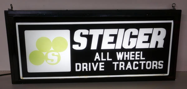 16"x35"x6", original plastic face & steel can, very clean and nice; great smaller size; came from the Vern Eymann Estate of North Dakota, never sold or seen this particular Steiger sign!