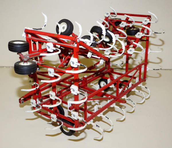 Frame is 100% scratch built from streel and brass; plastic Ertl gangs used that have been painted white; paint is flaking off the bottoms, 38" wide when unfolded! Great looking piece; not marked, but came from the Eymann collection