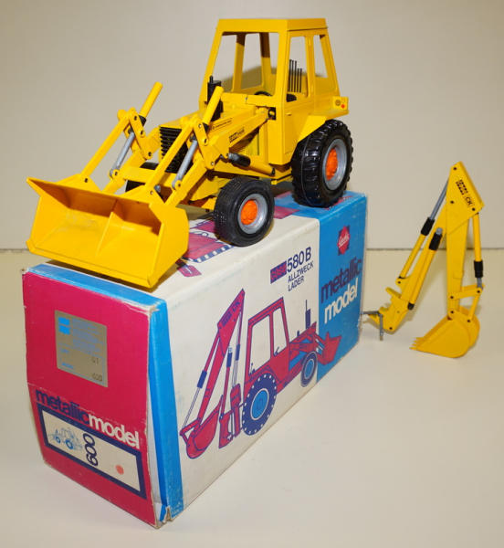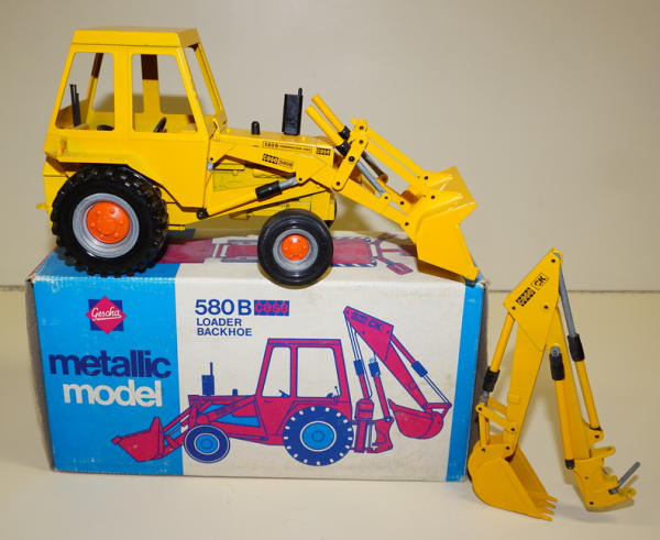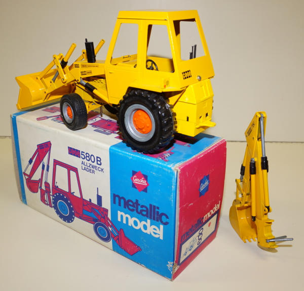 Mint toy, looks to have never had the backhoe piece put on, there are no chips in the hitch; box is complete and square, some discoloration and rub marks, box rates 8 condition; made in W. Germany