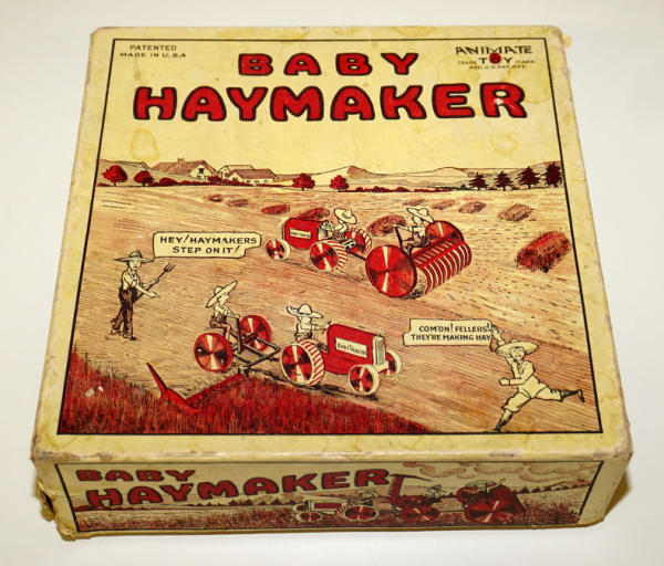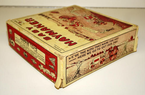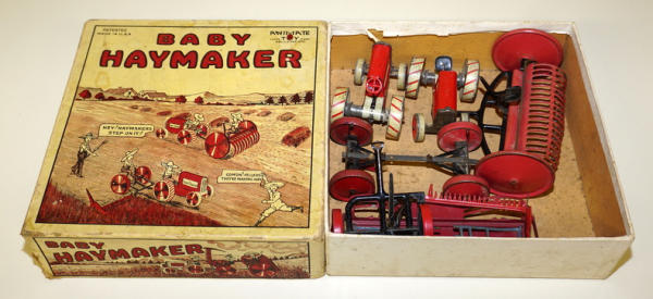 tractors are about 3" long and tin-litho, implements are all tin, all have some play wear, but good originals, neat graphic box and in good shape, no box liner