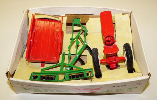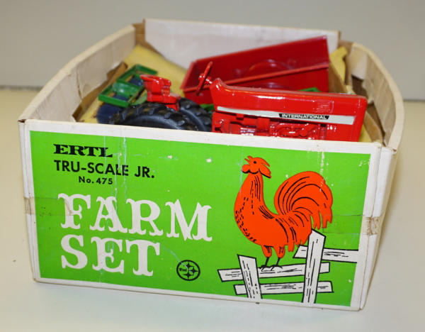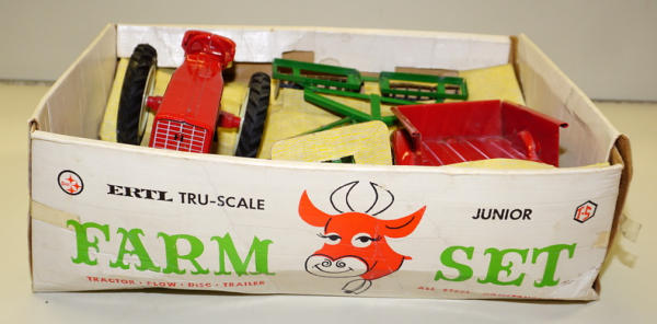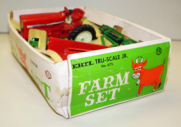 Toys are all mint to near mint condition, unusual set with the larger Ertl 3b plow, not the small Tru-Scale Plow, Box has some writing and general wear, overall rates 8 condition