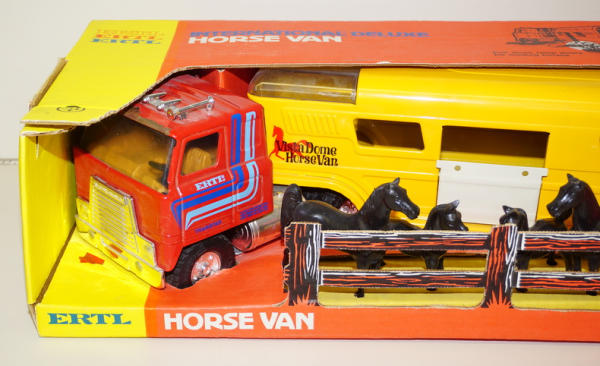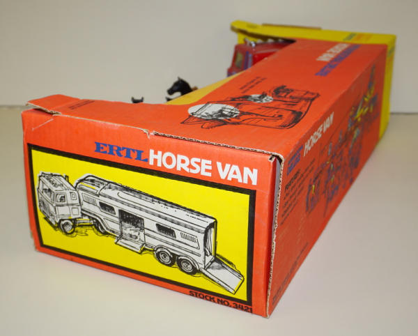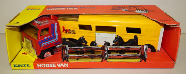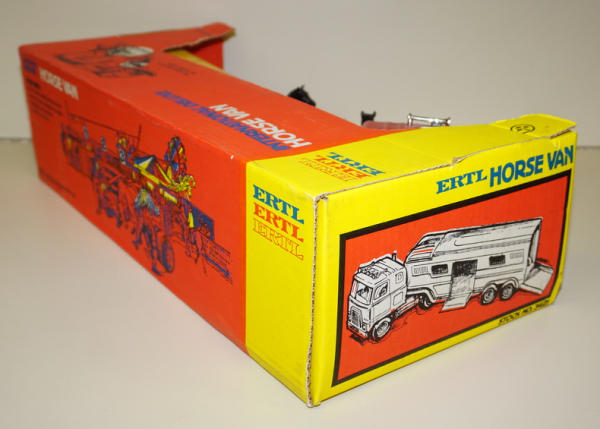 Red Truck w/ blue decals & Yellow trailer, never played with, but has heavy paint flaking on the cab top, box is clean, rates 8.75 condition