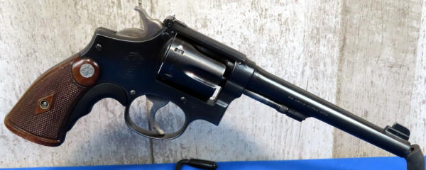 MRE; 6" BBL; wood checkered grips; grip extension added; 6-shot swing out cylinder; has some slight bluing loss; made in USA: SN#676838