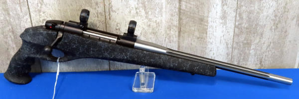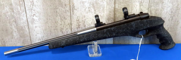 15" Stainless fluted barrel; synthetic stock; scope rings; smooth action; like new condition; right side bolt, making it a Left Hand shooter; made in USA; SN#WB015075