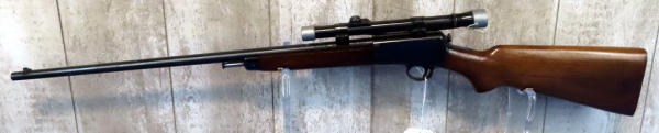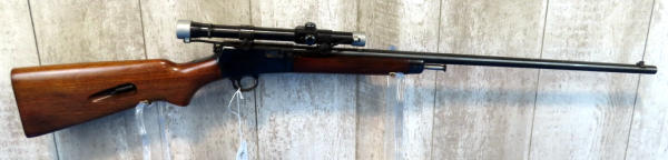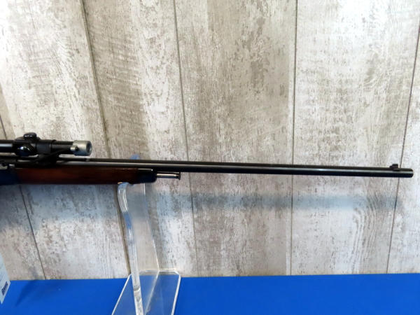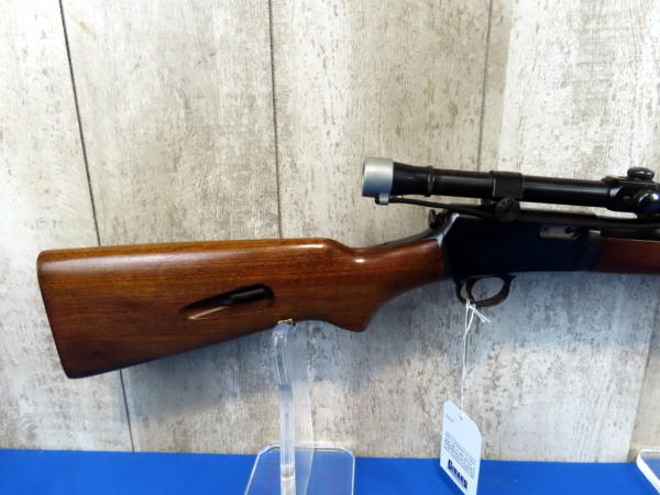 23" BBL; missing rear sight; Weaver J 2.5 scope; nice wood; minor scratching on the receiver; receiver tube in stock; SN#105972A