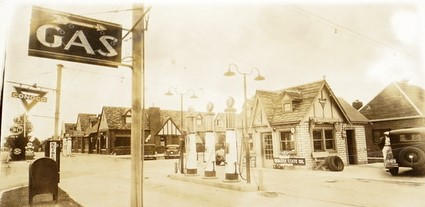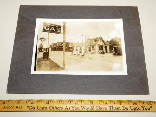 Shows 3 visible pumps with Conoco globes, GAS neon sign, Sinclair H-C Sign in the background and more, image is 5"x7", some wear, but nice overall