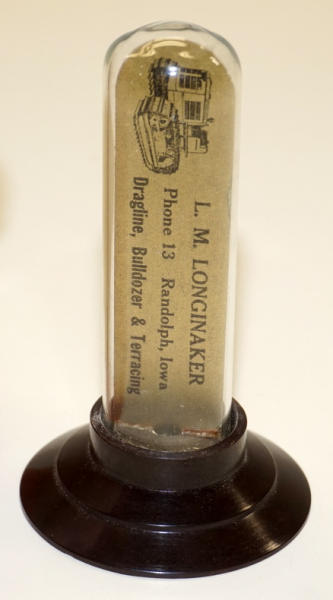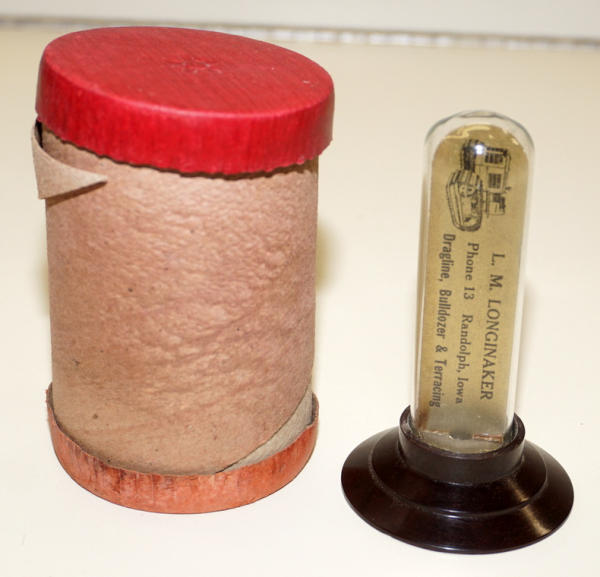 about 4.5" tall, great graphics, glass is broken at the base, but still displays fine, comes with the original cardboard tube, but it's rough, unique piece