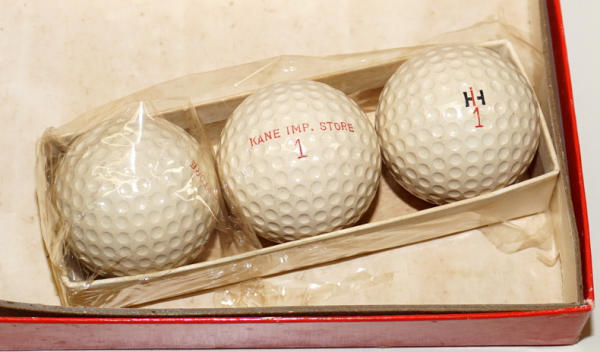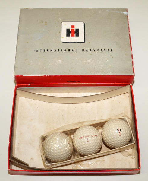 neat box, has 3 original balls with the IH Logo & "Kane Implement Store", some wear, but overall a nice set