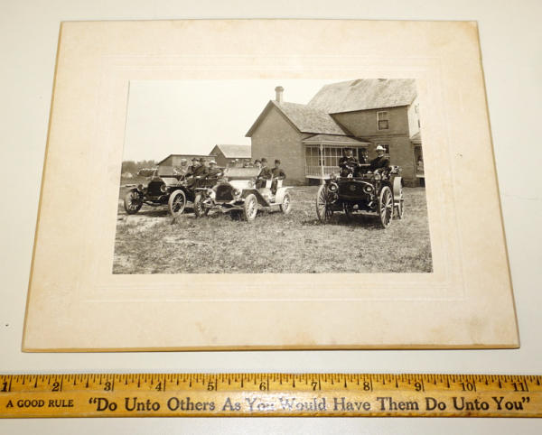 8"x10" card with a 5"x7" image, clean and nice, shows 11 men all dressed up in the early autos including a really early IHC high-wheeler too, photographer was from Little Falls, MN, so probably from somewhere in that part of the world