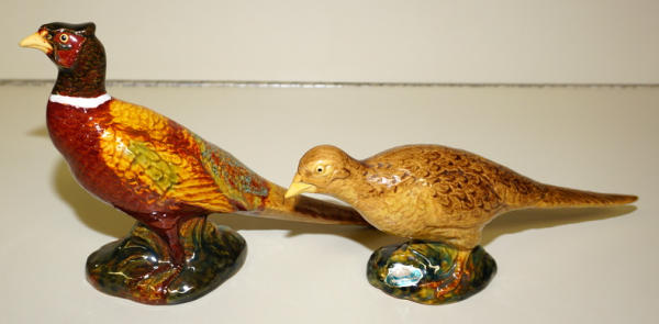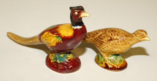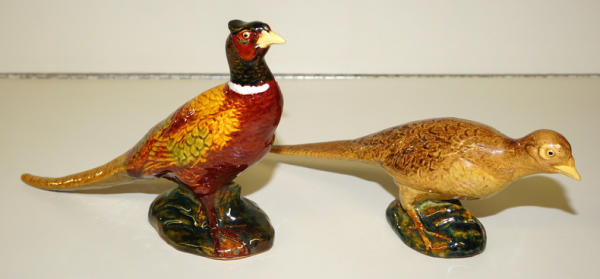 Rooster is 7.25" tall and mint; Hen has been professionally repaired on the beak, sells as a set