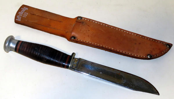 I don't believe this is the original leather sheath; blade has some wear & rusting; 5.5" blade;