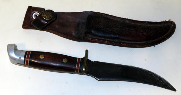 has some wear; wood handle; original sheath; 4.5" blade;