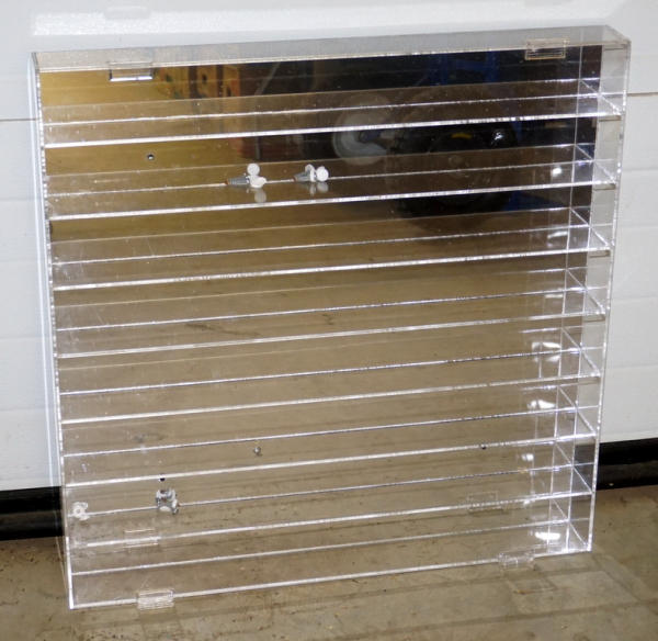 approx. 26"x26", 3" deep, 3" between the shelves; these have been used, so some light scuffs and scratches, but overall nice and would be perfect for 1/64th sale toys! No shipping, pickup in Wakonda only