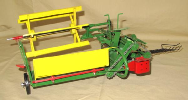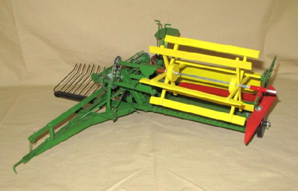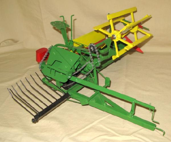 all scratch built from metal with a wood reel, 17" wide, drive wheel turns the reel and crank on the front works the chain and sickle, very nicely made model