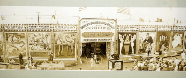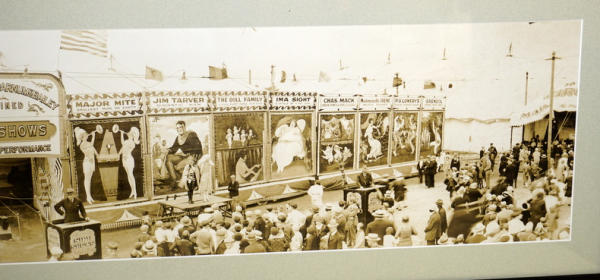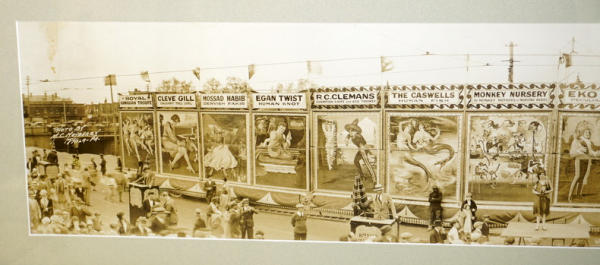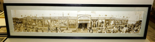 Panoramic view of 19th century marquees with some performers; fascinating photo by MC Mayberry Philadelphia, beautifully framed and matted, 47" x 12", possibly a reprint of the original
