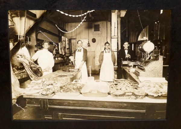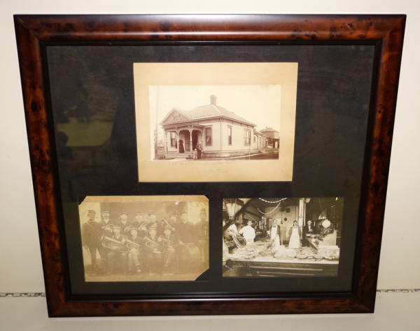 a band, a butcher shop and a house in Lincoln Neb pictured; interesting and historical; beautifully framed and matted, 20"x22", band card has some damage, others look good