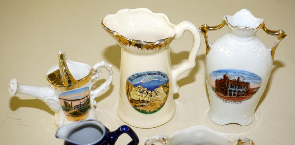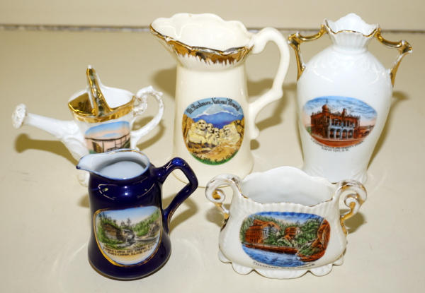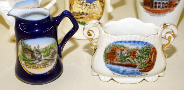 some are German made; scenes of Pierre Lodge and Spring Gulch, Rapid Canon, Black Hills; Sylvan; Triple railroad track, Lead; US Land Office and Variety Store, Rapid City; all perfect condition and telling beautiful story range in size from 2-5” tall; sells as a set