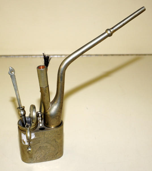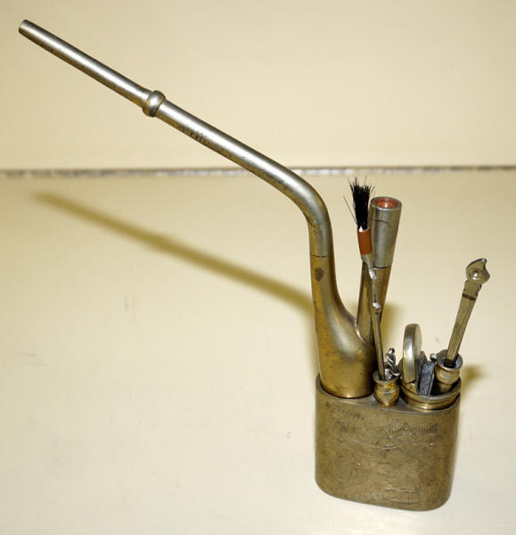 Three accessories engraved, excellent condition, 8.5" tall; not usually seen with original accessories