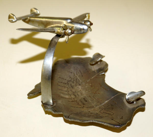 Excellent graphics of an engraved map of New Guinea and Australian war theater; ashtray 6" base, 3.5" tall, some patina and light wear, but complete