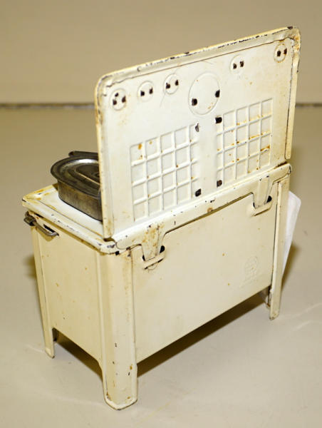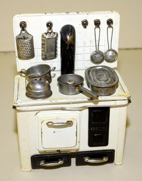 Missing one long handled pan, but has eight accessories, paint good, 6" wide, 7" tall; nice detail, cute piece