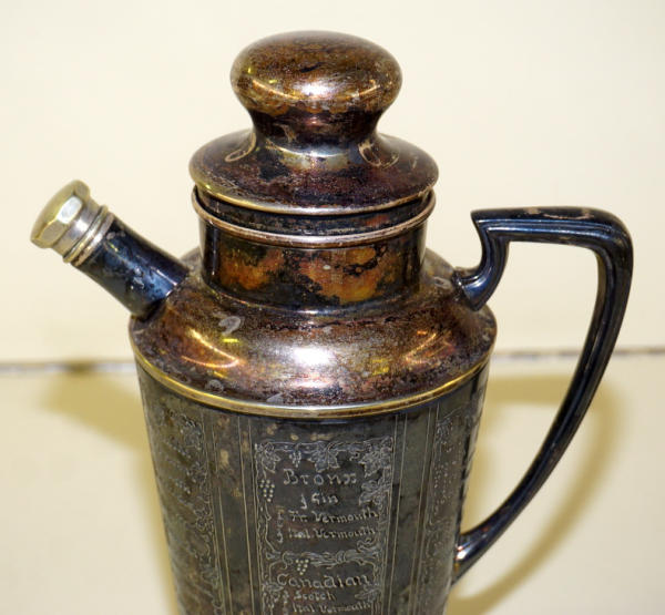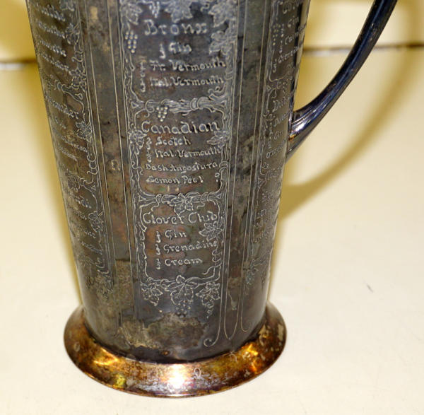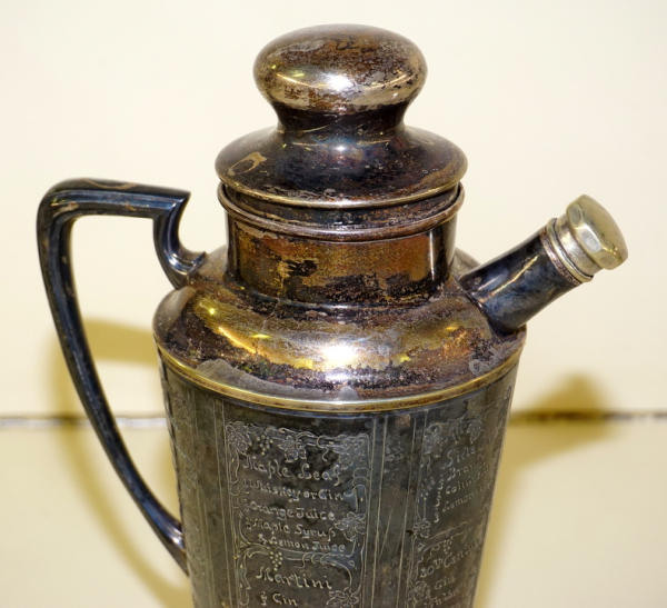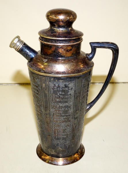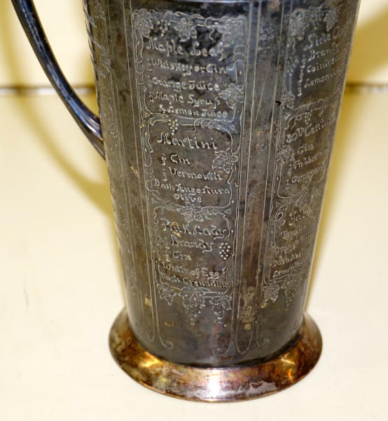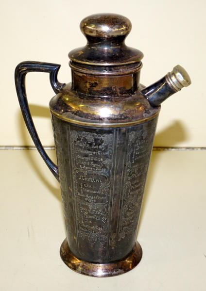 Silver plate, 11" tall, no dents, total of six cocktail recipes on sides, great bar adornment