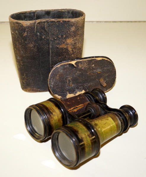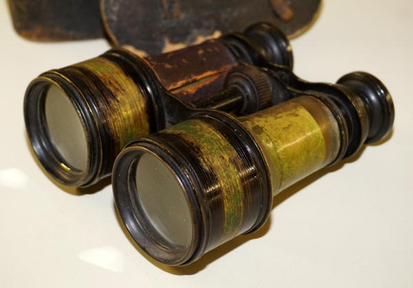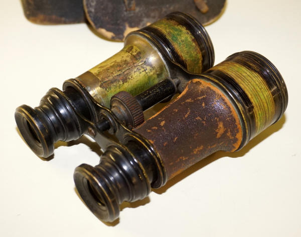 binocular case lid in poor shape; binocular has wear, missing one of the leather covers, 5” wide, 5.5” tall