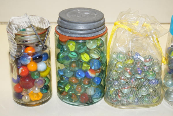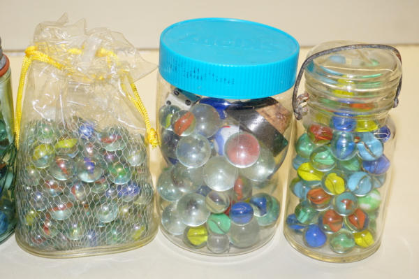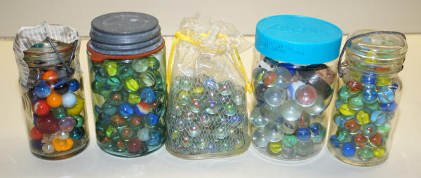 Approximately 50 each in smaller old fashioned topped jars; 80 in ball jar; 50 in bag I counted 64 in skippy jar; mostly cat's eye's, all to go