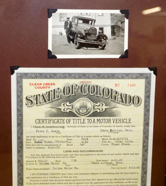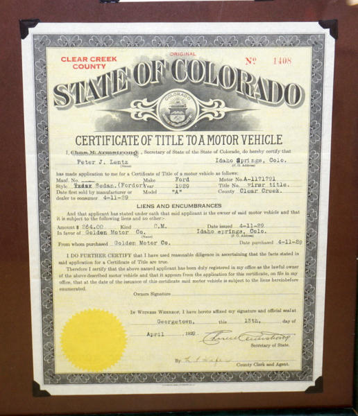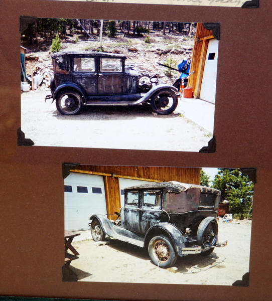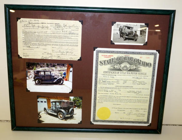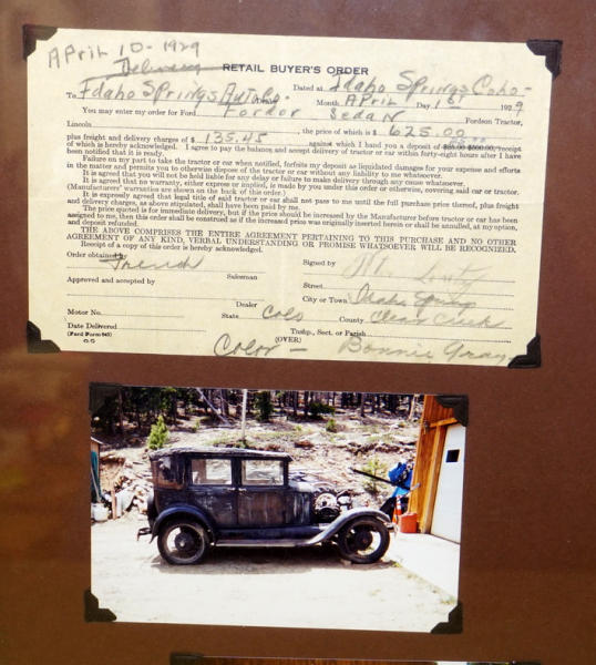 framed and matted fun group of pictures and documents of sale of 1929 Model A sedan with new owner picture and later pictures when it was pulled out of the barn; a great conversation piece especially in a man cave; 21"x17.25"