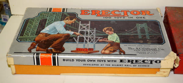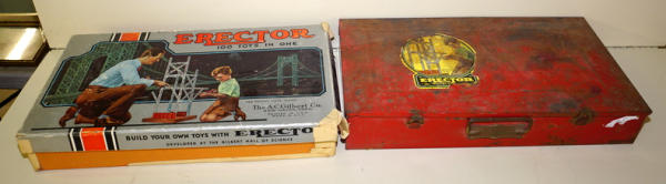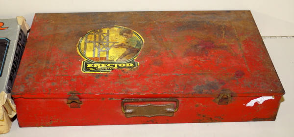 circa 1950s; one cardboard box (includes motor, houses wheels, and hardware); one metal box (no motor but wheels and hardware) largest box is 18" long; box corners have been taped and torn; Boxes both have heavy wear, both to go