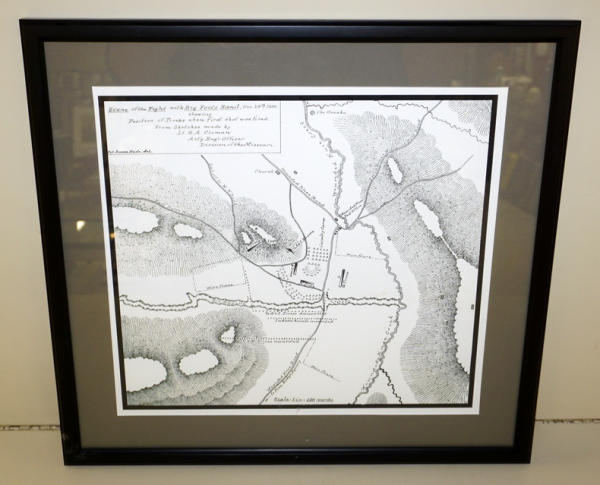 Exquisite hand-drawn reproduction of this event depicts position of troops when first shot was fired, beautifully framed and matted, 22" x 20"