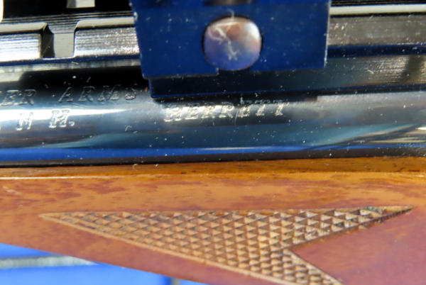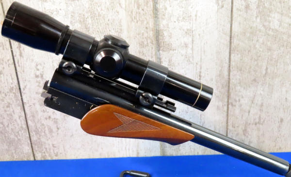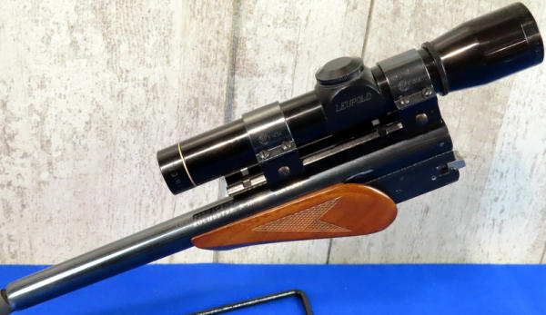 used; 10" Bbl.; has some minor bluing loss at muzzle; wooden forearm; Leupold M8-2X scope; very hard caliber to find; no transfer needed