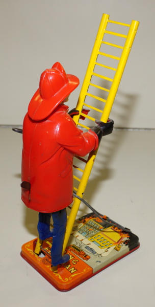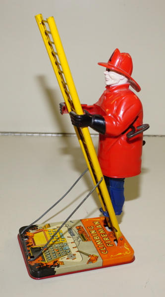 11" tall overall, works with some help, a few of the ladder rings are bent, so the foot wants to catch while he's climbing,