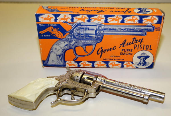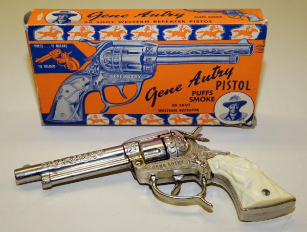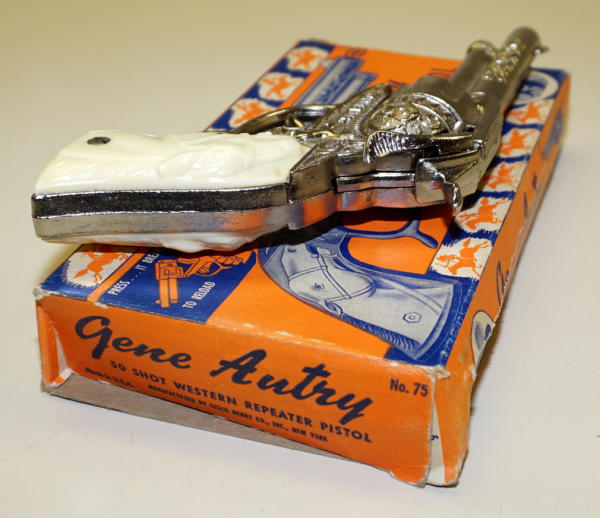 9" long gun works like new, plastic horse head grips, good looking original box with light wear, box rates 8.5 condition