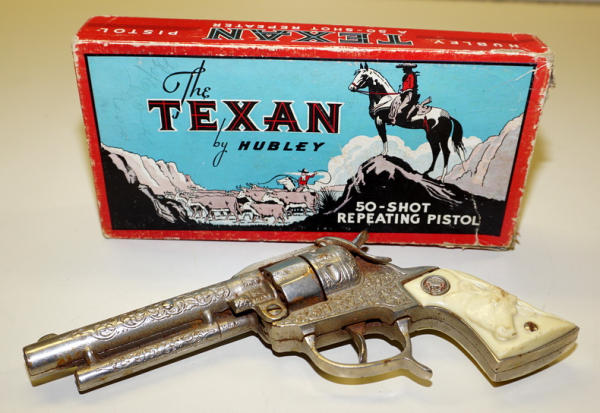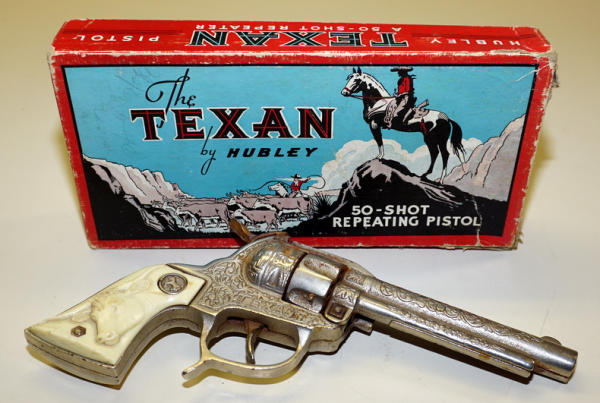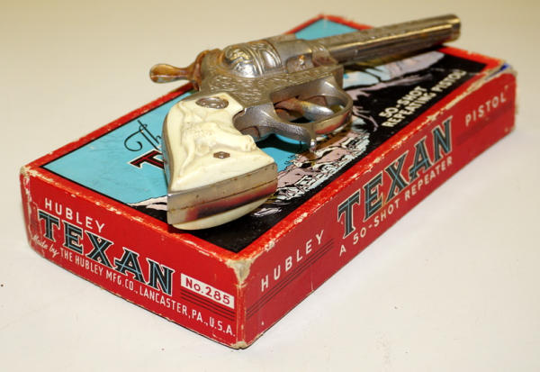 9.5" long, cast iron, has rust in the mechanism and does not work, graphic box has some wear, box rates 7 condition