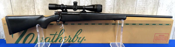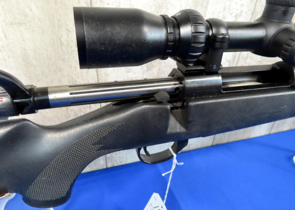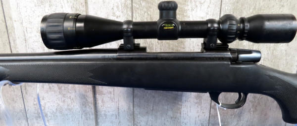 24" BBL; smooth action; BSA Contender 3-12x40 scope; scope has some sticky residue that needs cleaned off; factory box; has been used; black synthetic checkered stock; good deer gun; Japan; SN#VS122989; A9